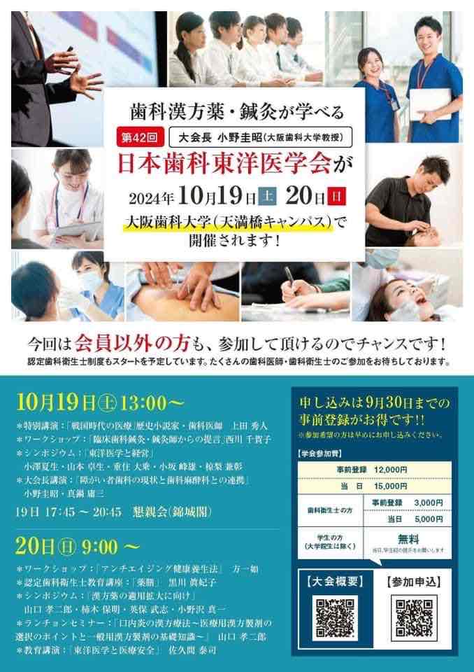 歯科✖️鍼灸を学ぶ2日間です!今年度の日本歯科東洋医学会は、大阪大学 歯学部と大阪歯科大学がタッグを組みます。開催場所は大阪天満橋にある大阪歯科大学。歯科医師でもあり鍼灸師でもある久保 茂正先生が実行委員長をされます。歯 […]