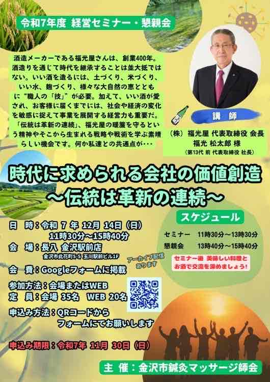 金沢市鍼灸マッサージ師会 令和7年度 経営セミナー ご参加は鍼灸マッサージ師でなく、一般の方でも「参加したい!」って希望があればGoogleフォームでお申込みいただいて結構ですよ! 日 時:令和7年12月14日(日) […] |