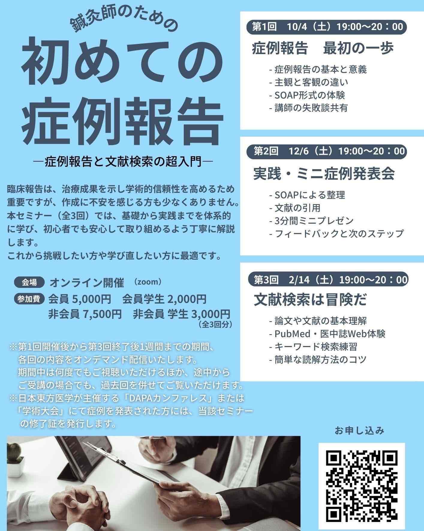 【セミナーのご案内】 日本東方医学会主催 \鍼灸師のための「初めての症例報告」/ 臨床での経験を学術的に共有できる「症例報告」。 大切だと分かっていても、いざ作ろうとすると「どう書けばいいの?」「難しそう…」と感じる方も […] |