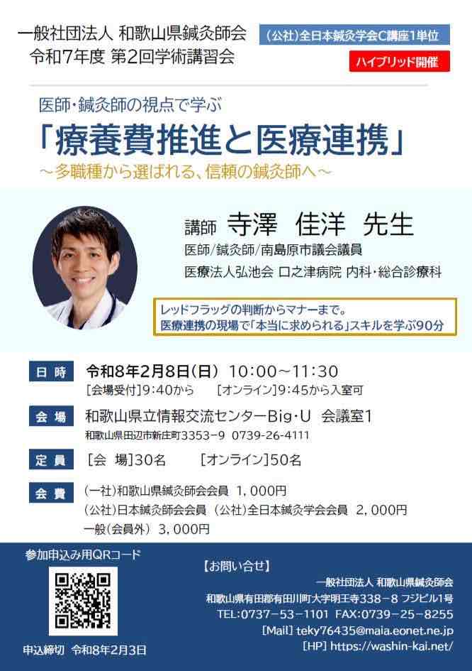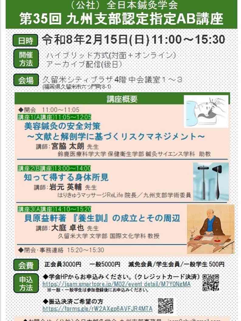 【学術講習会ならびに全日本鍼灸学会C講座開催のお知らせ】 新年あけましておめでとうございます。 (一社)和歌山県鍼灸師会では、令和7年度 第2回学術講習会【全日学C講座ならびにハイブリッド開催】を下記の通り開催いたします […] |