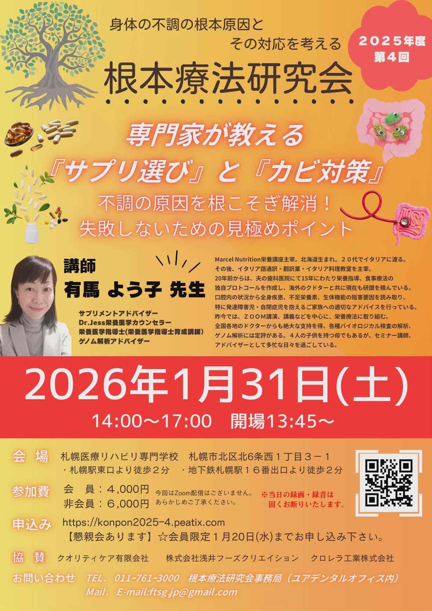 【根本療法研究会】講演会のお知らせ 2026年1月31日土曜日は 根本療法研究会主催 2025年度 第4回講演会です。 今回は、有馬よう子先生をお招きし『専門家が教える「サプリ選び」と「カビ対策」』と題しご講演をいただき […] |