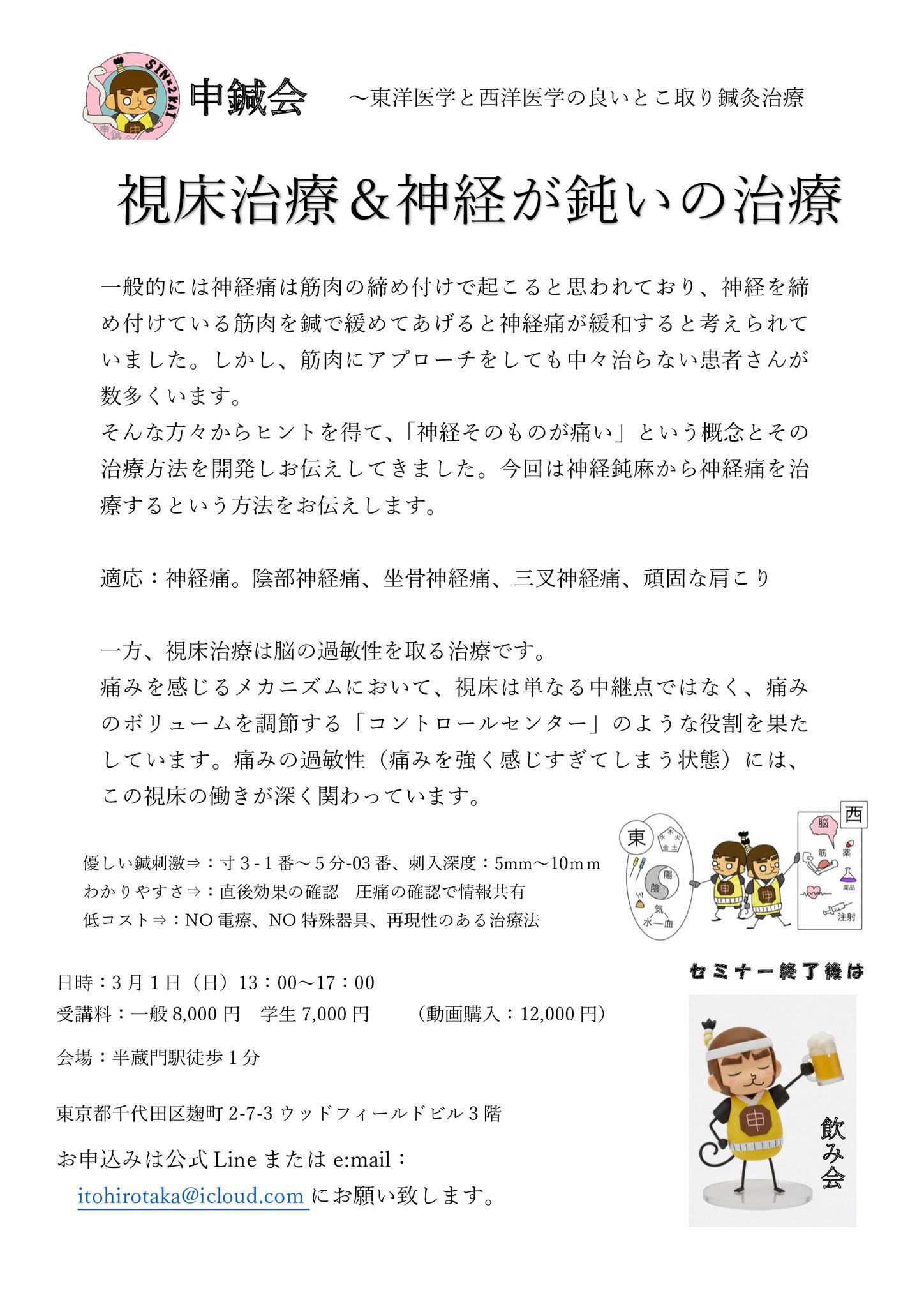 3/1(日)の鍼灸セミナー案内できました! 今回のテーマは『視床』です なお、はりきゅう国家試験お疲れ様企画として 今回国試受けた方でセミナー参加された方に 飲み会代を申鍼会で負担します |
